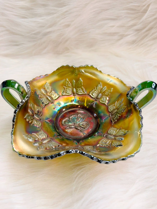 Antique Crown Crystal Butterfly Prasem Carnival Glass Bowl [with Exclusive NFT]